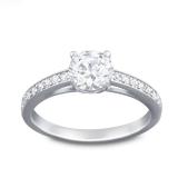 The perfect romantic gift. This stunning, rhodium-plated ring features a round chaton in the center with sparkling chatons on either side. The chatons embellish the front half of the ring.
