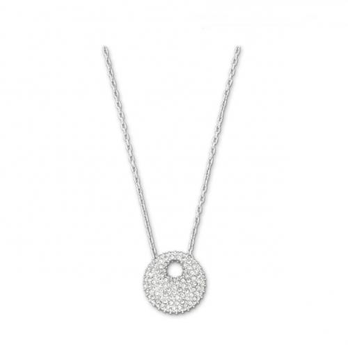 With a sleek, organic silhouette, this mini pendant brings chic, modern elegance to any outfit. The front is adorned with clear crystal pavé. It comes on a rhodium-plated chain.