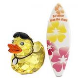 Sunny Steve sparkles in Light Topaz crystal with a Sun crystal beak and Metallic Silver eyes. He comes with dark black metal sunglasses and a funky surfboard with a floral print. This cool surfer duck wears a necklace featuring a shark’s tooth in White Alabaster crystal.
