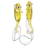 This pair seahorses sparkles in faceted Light Topaz crystal.Noses glow in Jonquil crystal and their fins gleam in clear crystal.They are placed silver-tone metal display with an embossed coral motif.