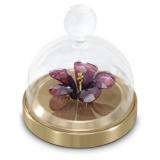 Hibiscus flower features bell jar shape. The hibiscus flower symbolizes youth, success, femininity and wisdom. On a champagne gold-tone metal stand, protected by an elegant glass bell. Made of purple and pale yellow crystal with 385 crystal facets.