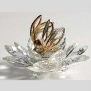 蜂鳥正在花朵的底座上採蜜,水晶蜂鳥的翅膀上有清澈綠色的水晶。蓮花型水晶底座底部有3個水晶座腳。